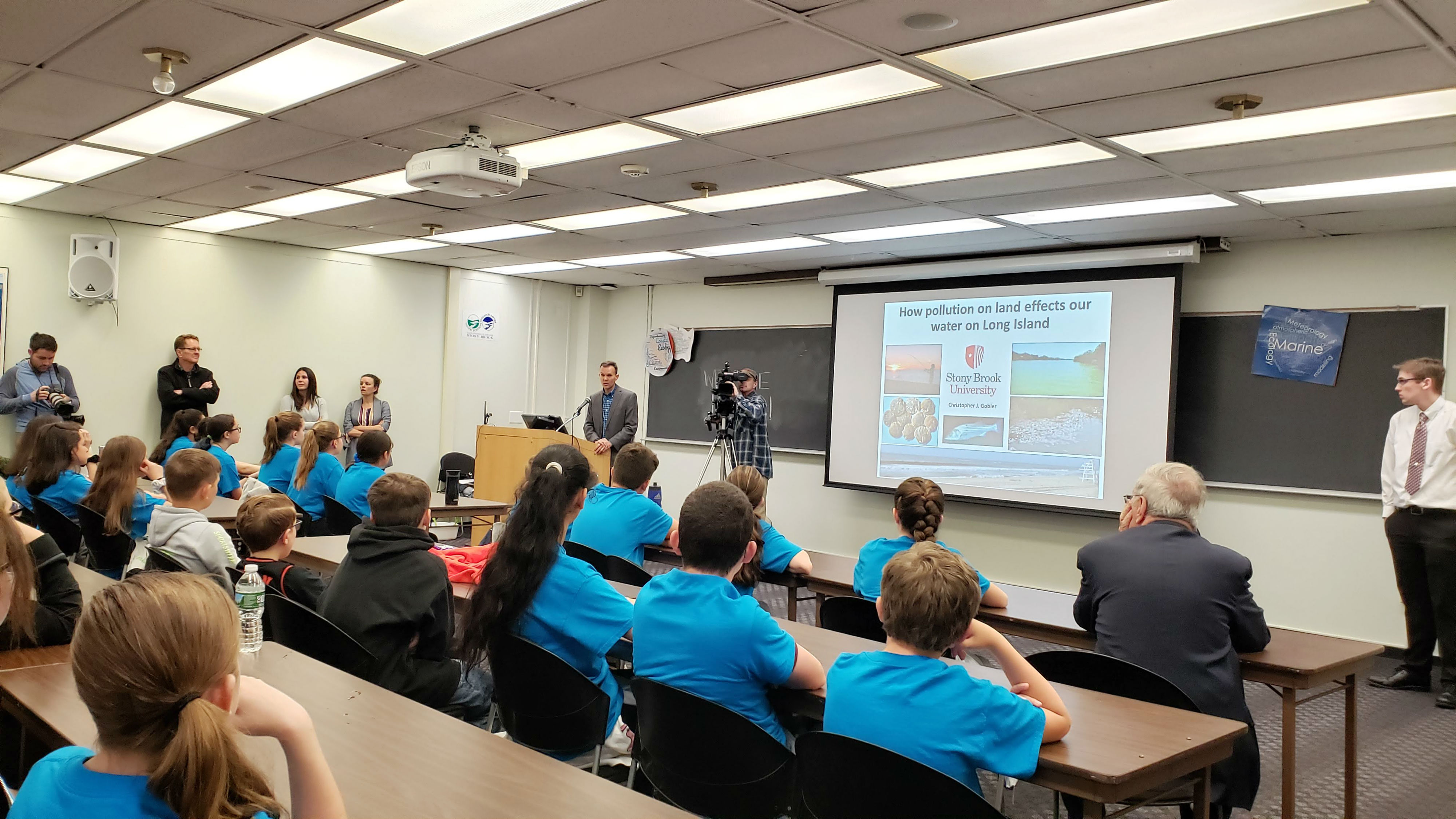 - Participating students join us at Stony Brook University, where they present their research projects to their peers, Stony Brook University professors and Long Island Pine Barrens Society staff. Projects are presented through posters or by PowerPoint or video presentations. Students receive lunch and hear a talk from world-renown marine scientist and professor, Dr. Christopher Gobler of Stony Brook University’s School of Marine and Atmospheric Sciences. Student projects are evaluated using our rubric, based on the New York State Department of Education’s science standards. Finalists are chosen and are later recognized at a ceremony where students are able to meet with and present their ideas to local elected officials. Students receive awards from the National Grid Foundation and proclamations from the local officials. The awards ceremony is often featured on local news stations.